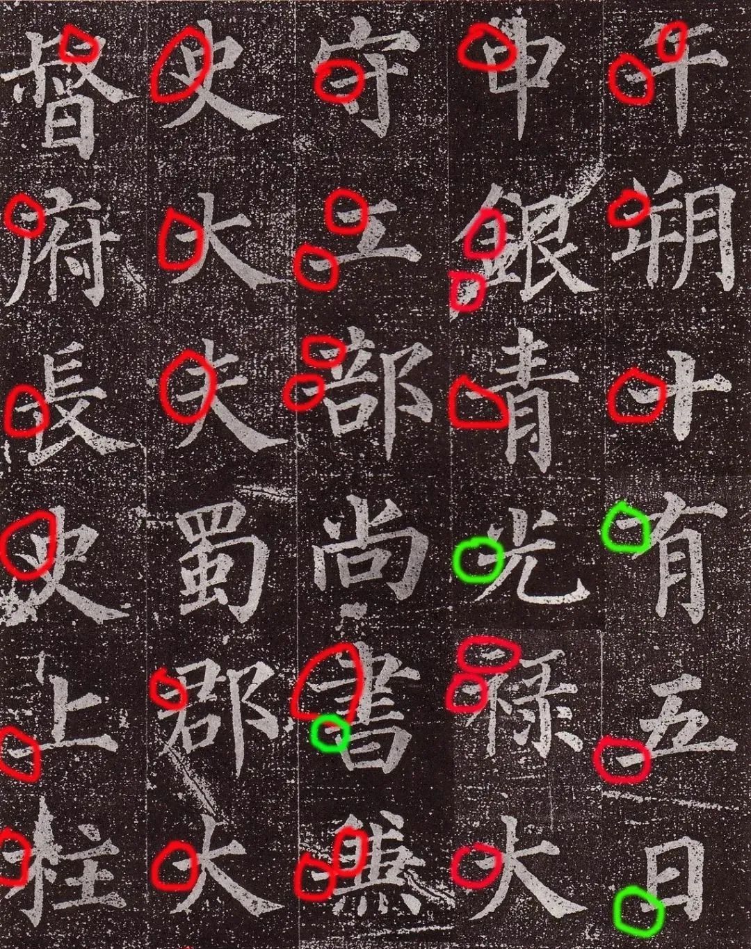 其实如果我们去看原帖,书家的用笔习惯往往就体现在那些不被选中的所谓的“不标准”的字体上,近些年拍摄影印技术得到了极大的提升,使得我们这些普通书法爱好者也能通过影像见到古代名家书法的原版真迹,仔细去研究我们就能发现其中端倪,其实颜真卿的书写并没有藏锋的习惯。比如我们常见的《多宝塔》的第一页,我们以横画为例,所有的横画基本都是“露锋”起笔的,我用红笔标出来的,明显看到是没有“藏锋”的,绿笔标出来的看似“藏锋”其实那是因为书写速度快,上一笔在右边结束后,笔锋快速向左落在纸上导致的,而且这部分的比例很低。