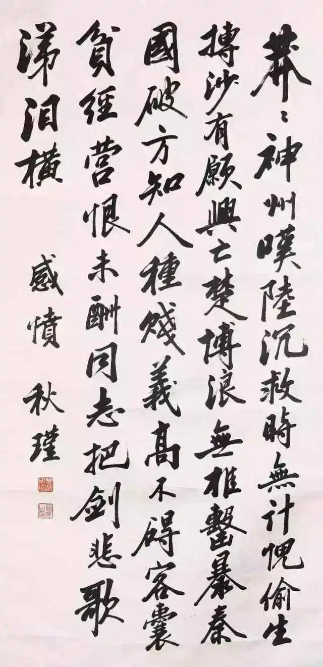 就秋瑾的书法而言,是一位非常有传承的书家,她的书法继承了明清、民国时期书法的主要风格,达到了碑帖融合的程度,作为一名女子,她擅长榜书创作,其笔力遒劲,笔法分明,既有碑版书法在笔法上的雄浑厚重,也有帖学书法的轻柔与飘逸,因此她的书法是融合了碑帖要害,形成了鲜明的个人风格。