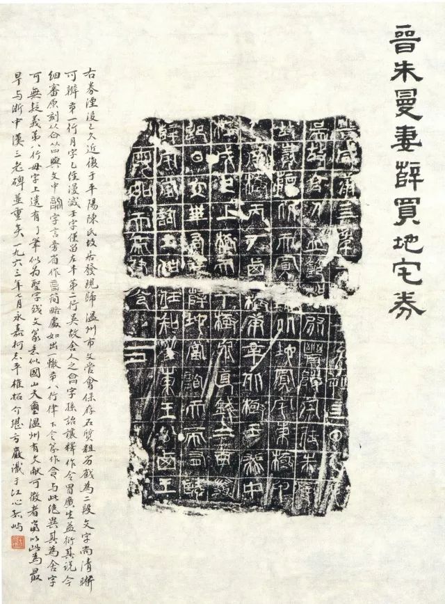 “朱曼妻薛氏买地券”刻于东晋咸康四年(338),长方形,纵30厘米,横17.2厘米,厚8.5厘米。石质粗松,色灰黑,已断裂。石面阴刻篆书文字106字,共8行,前7行每行14字,最后一行8字。格线粗细不匀,刻得较为草率。券文如下:
