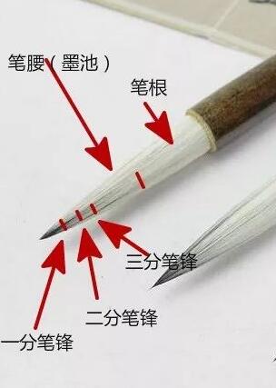 笔锋的三分位置再往上,就是笔腰位置。笔腰,古人又称之为墨池,这就是毛笔存墨的主要地方。