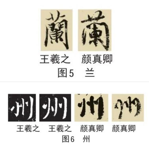 颜真卿行书有别于二王之处主要是强化“篆籀笔意”和“外拓法”,形成宽博、开张的特征。“外拓”是与“内擫”相对的一种笔法,从图5中两个“兰”字的写法就可以看出,王羲之用的是内擫法,颜真卿则是外拓法,颜真卿强化圆转遒劲的篆籀笔法和外拓手法,并形成强烈的个人风格。