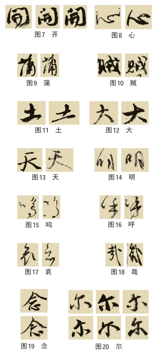 如图7中的三个“开”字,在转折、连带和空间上都有微妙变化;在图8—图13中,颜真卿的处理方法是“轻重”,一重一轻,一实一虚,入笔的角度、空间的松紧和墨色的变化都有巧妙变化。其中,图8中的两个“心”字、图9中的两个“蒲”字、图11中的两个“土”字、图12中的两个“大”字,采取了“侧锋切入”和“中锋直入”的变化手法。在图14—图18中,颜真卿采取“连断”的变化手法,一断一连,一简一繁,绝不雷同。同时融入草书写法,使得书写变化更加丰富。