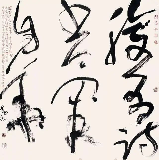 刘洪彪是当代书坛上很有影响力的书法家之一,他的草书作品注重整体感和形式感,强化空间对比、墨色变化等,赋予作品的外在表现和精神内涵,例如他的作品中采用小楷来弥补草书之后的空间布置,以浓、淡、干、湿、枯增强作品的层次感,为书法意境美营造矛盾对比关系。