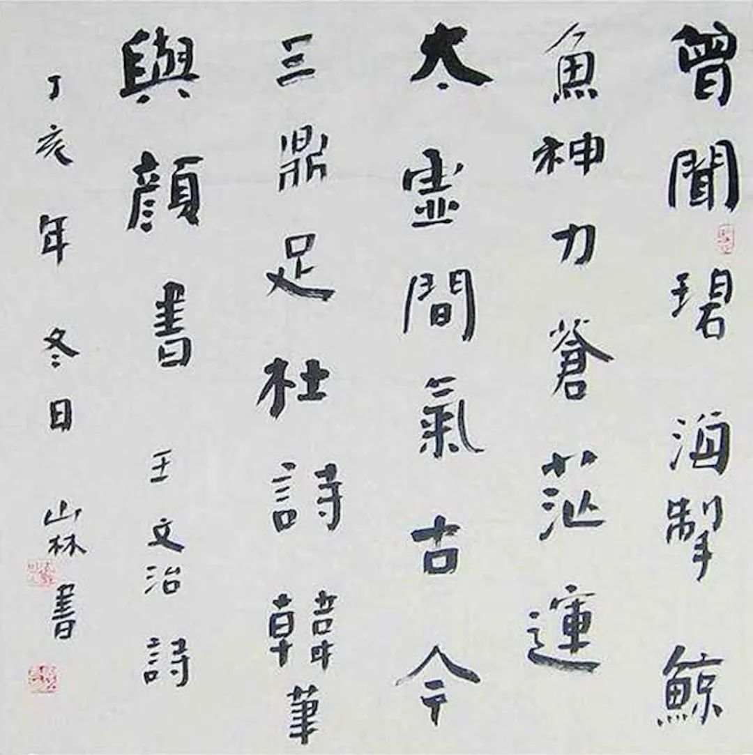 说到楷书的艺术性,如果按照古人的表现方式,当代书法的艺术性是很难实现的,就拿那幅颜体书法风格的作品来说,作者在其中运用了字的大小、点画的粗细、墨色的虚实等等各种各样的矛盾关系,使本来“状如算子”的唐楷,一下变成了当代书法艺术,可以说,这是当代书法艺术性的最能说明问题的一幅作品,这些方法当然也可以运用到其它书体的研究与创作之中。