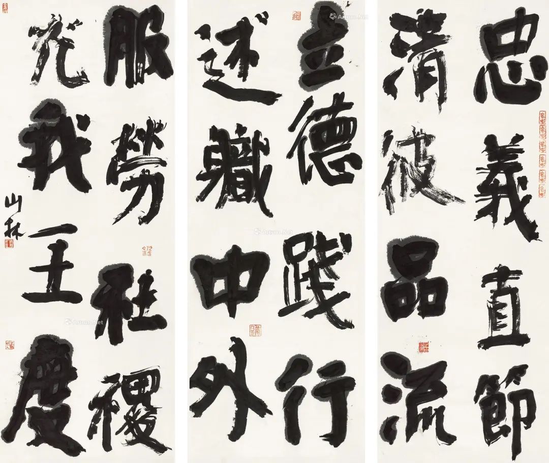 就在这时,很多大的书法展览中,大都是以行草书来表现书法的艺术性,而楷书的入展率是很低的,尤其是唐楷,想要走进这个展厅里是何其难啊。就在这时,有一副写颜体楷书的作品入选了全国书法展,并且还获得了一等奖,此作品也引来来书法爱好者的大辩论,因为这幅作品虽是以颜真卿楷书风格出现的,但完全与颜真卿的宽博雄浑截然相相相反,而是在作品中以“艺术性”的面貌呼啸而出,就像当年徐渭的“乱石铺街”一样,让人耳目一新。