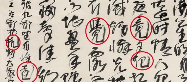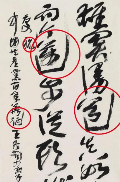 实际上他所有回到传统的字,在写类似笔画时都是这个样子,可谓是逢钩必挑。在他看来这就是所谓创新了,实际这种新只是一时的新,用一种相对固定的形态取代前一种,然后一直重复做这个过程,所谓的新很快就又旧了。真正传统书法,到了高境界随时在变,这种自然变化绝非脑子所能想到。看王羲之、颜真卿每一个帖的面貌都不一样就能明白,自然出新比创新要高明的多。