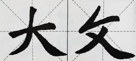 如果要写好一个汉字,首先要懂得取势,其次才是书写笔画和结体。取势,就是书写一个字时,它的笔画多长,斜度大概多少,弧度多大,在下笔之前就要做到心中有数。比如书写“人”字和“大”字,撇画的弧度是不一样的。如下图。“大”字的撇画弧度更大一些。“人”字的弧度更偏直一些。