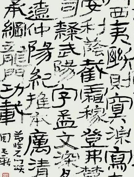 上图是十二届全国书法篆刻展上入展的一幅隶书作品。可能对于许多书法爱好者来说,尤其是对于隶书创作者来说,只要把隶书写得古朴质厚,符合大众审美标准就行了。其实,这只是几十年前的观点,如今,书法作为一门书写的艺术来说,只把它写得漂亮好看,是远远不够的。就书法艺术性来说,除了书写的技法和笔法以外,还应当要有综合水平、认知能力以及艺术眼光的参与。那么,这幅作品有哪些可以让人认同的地方呢?