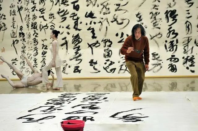 现在这种夸张变形也没有新鲜感了,在创新推动下,当代官方书法继续沿着西洋画走过的路发展,从美国回来的王冬龄模仿抽象画,搞出了抛弃了汉字的乱书。这还不算完,他还模仿行为艺术、装置艺术的表现方式来进行书法创作,离书法传统越来越远。