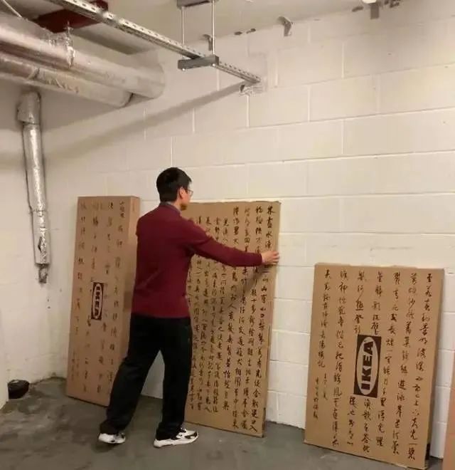 他突发奇想利用废旧纸箱在上面写字 而展厅在垃圾站