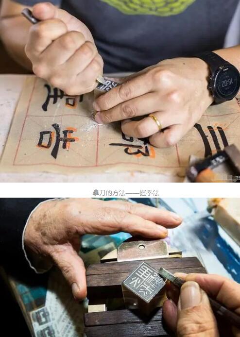 刚开始学篆刻,大多数人拿刀的姿势不正确,甚至还有人会不小心划破自己的手指,给自己学篆留下了心理阴影。怎么握刀,一种是执笔法(见上图),一种是握拳法(见上图),刀法有两种:冲刀法,另一种是切刀法。开始学篆刻,不管是学刻白文印还是朱文印,首先要能刻好直线,其次要会刻弧线,做到线条粗细得当。刀法,要尽可能做到凌厉坚挺,刀刻下去要果断,力度要均匀,深浅适宜。在刻转弯角或内弯角的时候,刀法要精妙,不崩角,不破边,当然刻好后轻敲印面几下,人为残破,是另一回事,这是为了营造一种仿古的效果。
