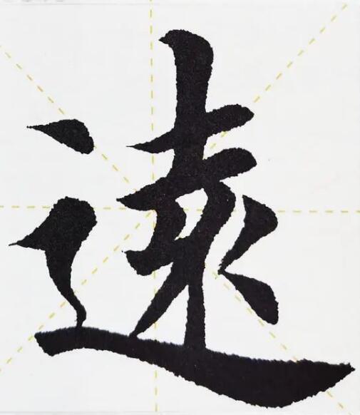 这主要是形容笔画书写当中起笔凝重,结笔轻疾的一种书写形态。比如隶书的长横画和楷书的捺画。不要小看“蚕头燕尾”四个字的含义,真正要领会它的书写要领,需要下一番功夫。比如楷书的捺画,起笔要顿笔,写出蚕头,再轻提笔写出燕尾,它是由三个部分组成,头、颈、尾部。如下图的“逺”字。