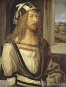 在阿尔卑斯山以北地区,同样有一位闻名遐迩的文艺复兴画家创作了许多个性鲜明的自画像,他便是丢勒。丢勒的绘画风格与拉斐尔大不相同,他更加注重数学比例,这大概与尼德兰人严谨的性格有关。丢勒在年轻时曾游历意大利,学习了意大利文艺复兴艺术的许多观念与技法,之后回到老家尼德兰,又结合了当地的艺术风格,发展出了具有典型尼德兰文艺复兴艺术风格的作品。与拉斐尔的自画像相比,丢勒的更加严肃,也更具有英雄式的自画像风格。他曾创作了16幅自画像,既包括独立式自画像,又有旁观者自画像。他共绘制了3幅独立式自画像,多为纪念个人的标志性事件而作。丢勒自从13岁为自己画过一张自画像后,就开始逐渐成长,成为一名成熟的肖像画家。他于1498年创作的一幅自画像具有非常恢弘的诡秘感。画中人物形象的衣着非常华丽,放在边缘的双手特意戴了手套,表达了身份的高贵。画中远处的景色是非常具有代表性的阿尔卑斯山,似乎想要向观众透露他曾经穿越阿尔卑斯山前往意大利游学的经历。在这幅画的右侧,丢勒写下:“这是我26岁时给自己画的像。阿尔布莱希特·丢勒”。画面表达了一位年轻男性向艺术家迈进的勃勃雄心。