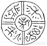 图文组合,图案与篆书文字的组合在篆书图示中很常见,这种融合呈现出丰盈多姿的形式,多以纹样点缀衬托文字,注重纹样与文字内在的趣味创造,形态上构成方圆、疏密、动态的变化与均衡的各种呼应,纹样与文字空间关系协调,装饰得当,图文相映而视觉绚丽。汉瓦当“宫”字位于圆形当面中央,篆字结字方正,线条爽利。“宫”字上方有形似宫殿屋顶的曲直线,视觉高大华美,线外饰有四个圆乳钉。“宫”字下方,有一仰头鸣叫、双爪翩翩起舞的朱雀,形象新颖,简约生动,构思奇巧。在这一类装饰性篆书载体中,篆书与线条分割出的方、圆、奇、正等形态各异的空间构成总体的空间,有对称、十字分割、中心辐射、九宫格、同心圆、自由结构等丰富的空间布局形式,在有限的图形空间里,创造了无限丰富的艺术语言。