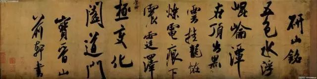 米芾用笔方圆兼备,刚柔相济,藏锋处微露锋芒,露锋处亦显含蓄,垂露收笔处戛然而止,似快刀斫削,悬针收笔处有正有侧,或曲或直;提按分明,牵丝劲挺;亦浓亦纤,无乖无戾,亦中亦侧。一洗晋唐以来和平简远的书风,创造出激越痛快、神采奕奕的意境。所以清高士奇曾题诗赞曰:“蜀缣织素鸟丝界,米颠书迈欧虞派。出入魏晋酝天真,风樯阵马绝痛快”。