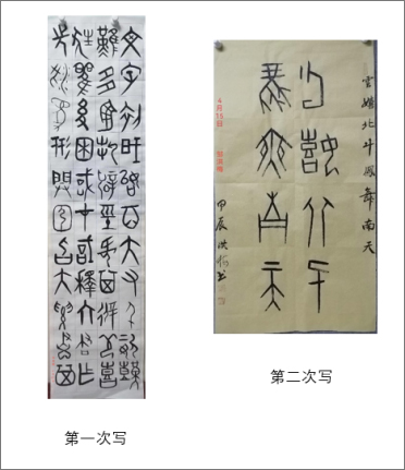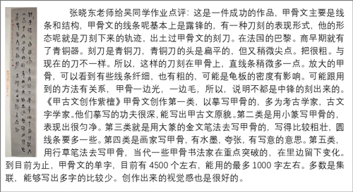 比如:甲骨文的书写,我之前对甲骨文书写一无所知,就在这一两月内,通过张晓东、宋春青、刘安社等导师的指导,我觉得自己的作品无论笔法还是章法,都有很大幅度的提高。