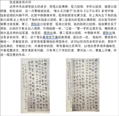记得张成银导师在点评我的作业之前,还联系我把书写的秦简原贴发给他认真研读,并把作业打印出来批改,他对书法的严谨,对工作的一丝不苟,令人倾佩。
