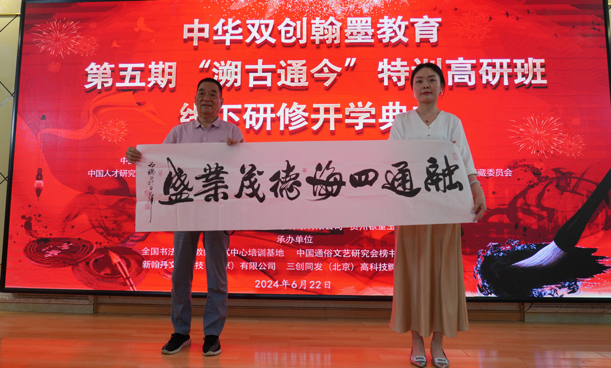 6月22日上午9时,开学典礼在维也纳酒店二楼会堂隆重举行。中共中央宣传部原副部长、中国文联原党组书记、中国关工委常务副主任胡振民,第十一、十二届全国政协常委、中国书法家协会第七届主席苏士澍,中国书协第七届副主席兼篆书委员会主任包俊宜,中国长城学会副会长兼秘书长袁安升,中国社会工作联合会特邀咨询专家、中联口述历史研究会咨询专家苏林波,教育部原办公厅常务副主任兼机关服务局局长高聚慧,中国关工委副秘书长兼公益文化中心主任李国强,中国语文报刊协会规范汉字书写专委会秘书长董杰、学术委员会培训部主任张坤、对外交流部主任杨军,中国通俗文艺研究会榜书艺术委员会名誉会长彭一珊、常务副会长朱国成、副会长兼秘书长杨光,中国保护消费者基金会副理事长、美国巴拿马太平洋万国博览会组委会(中国区)副主席、著名作家商泽军,中华文人艺术家协会会长、中外名家书画院院长邹为瑞,民进北京市第十六届委员会企业家联谊会委员、首德慈善基金会副理事长、国华人才研究院副理事长张方坤,中国书协会员、北京书协理事、门头沟书协名誉主席柳清芬,北京中宣盛世书画院执行院长张玲玉,本期高研班主讲导师王德恭、张晓东、孟 浩、张成银、宋春青、王先岳、刘安社、陈靛、李联合、陈晓、李春桥,教育总部的刘克奇、刘有高、林淑慧、陈禹、张奉振、王鑫等教职骨干,来自全国各地的参研学友,共计100多人莅临出席了开学典礼。