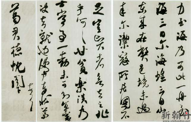 此帖自始至终,气韵十分流畅,下笔如飞,痛快淋漓,毫无顾忌,点画之际,妙趣横生。粗看,“全不缚律”,左倾右倒,形骸放浪。仔细赏读,却又欹正相生,字字随着章法气势变化,用笔狂放而不失检点,提按顿挫丝丝入扣,上下精神,相与流通,有着强烈的节奏感,与其作品比较,此帖颇具魏晋风韵,笔法圆转含蓄韵藉,有篆籀气。节奏也较平和,神闲气定,故能随意布势,妙得自然。