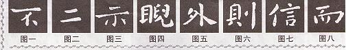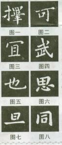 (七)折画是两种笔画的交接。折应写得方劲雄强。如图七“旦”字的折画,其写法是先写横,至折角时,用腕微向右上方翻动,将锋提至横画的右上角,然后迅速于纸面上侧势—翻,使锋面由阴面翻到阳面。翻笔时锋尖于纸上作暗圈,动作要爽利快捷轻灵。翻笔实际上就是使横竖二笔吻合得自然,以不露痕迹为上。小楷的折法,其整个动作是极其微小的,动作也是在极短的一瞬间完成,有时完全只是凭自己手腕中的一种感觉。同时,小楷的折法不可太显露棱角,宜含蓄一些。《宣示表》中的折有直折而下,如图八“同”字,也有倾斜的,书写时应注意笔势。