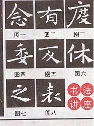 4.反捺。其写法是尖锋入纸,再向右下行笔,渐行渐按,至收笔时稍顿后反折回锋收笔。如图八“表”字的反捺。