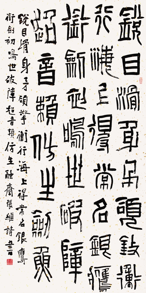 张继:全国政协委员、全国政协书画室副主任、中国文联全委会委员、中国书协副主席、中国书协篆书委员会主任,国家一级美术师,享受国务院政府特殊津贴专家。书法篆刻作品曾多次在全国书法篆刻展中获奖。长期担任全国书法篆刻展及兰亭奖评委。多次举办个人艺术作品展并出版《中国书画千字文——张继诗书画印展作品集》《水域大观——张继诗书画印作品集》《沧海•兵道——张继诗书画印展作品集》及《水域大观诗选》《融斋诗联》《隶书研究》《石门颂解析》等专著。多件作品被国家博物馆、中国美术馆等机构收藏。入选中宣部全国文化名家暨“四个一批”人才工程,被中宣部推选为“最美志愿者”。