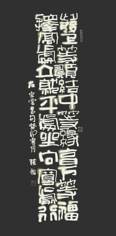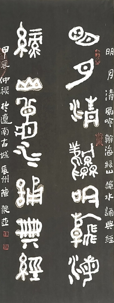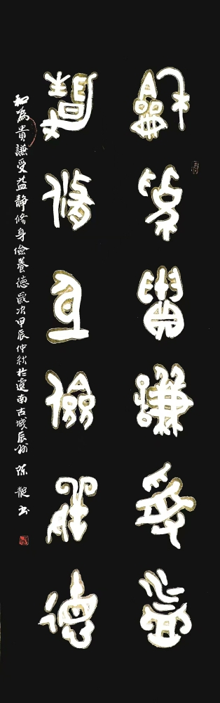 陈靛作品风格独树一帜,融合古文字古朴与现代审美创新,在传统与现代间寻得平衡,是一个典型的新古典书法践行者。其作品多次亮相全国各界展览,以独特视角和精湛技艺吸睛,被众多收藏家收藏,在艺术收藏领域留下深刻印记。