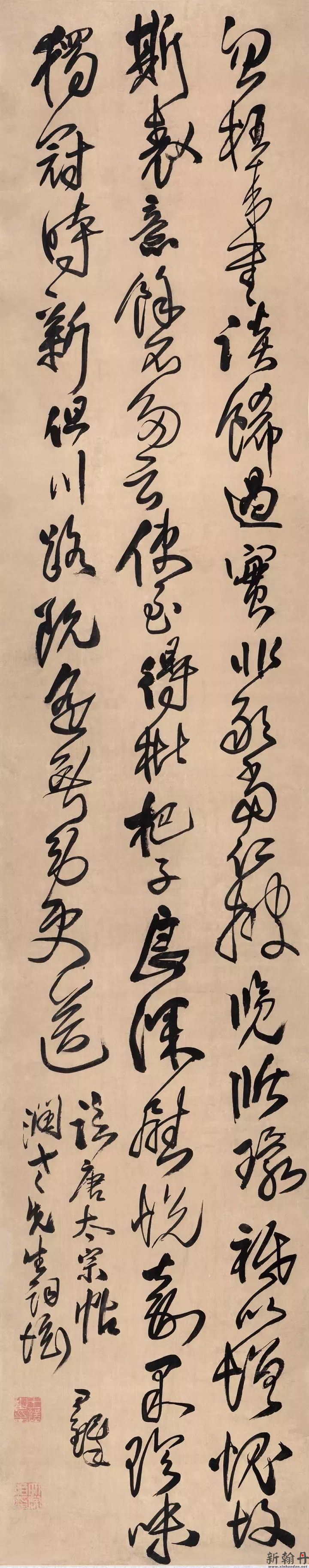 这里所谓情绪,不是指王铎仕清之后对朝政或者对满人的不满,而是指他对于自己的书法因为某些人的看法所引发的情绪。他当然对朝政会有看法,但是仕清之后与在明末崇祯朝时期相比较,这方面他是大大收敛了。崇祯朝时,他曾经在皇帝面前针砭现实,差一点酿成大祸。▲王铎 临唐太宗帖 绢本 250x49cm 辽宁博物馆藏