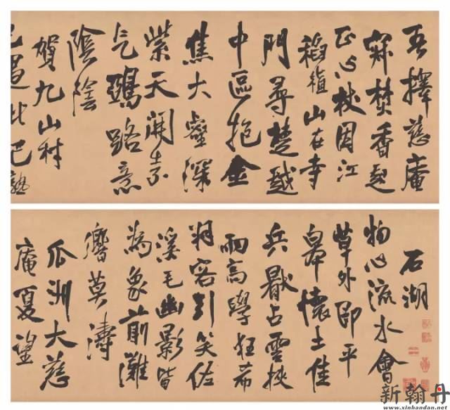 这个时候我们注意到了一个现象,即他一生中以杜甫的诗为内容,并且以草书手卷的形式来书写的书法作品许多都产生于这一时期。还有,这时他每每书写杜诗便会得意,一得意便下笔无滞,仿佛神灵给力,纸上墨迹灵动极了。 于是他要抒怀,当然不是抒发政治怀抱,而是抒发他的艺术情怀——非常有趣,每作这样的抒怀——即在卷末作题识的时候,他总是拿怀素来开涮,并且行文语气都带着一种情绪,所开涮的是关于书法所谓正脉和野道的问题。