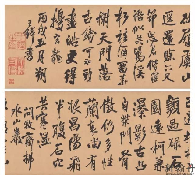 大家知道,王铎书法宗二王,一辈子崇拜羲献父子,至晚年依旧按日课“一日临帖,一日应请索”,而其临帖,主要就是临《淳化阁帖》中羲献父子的法帖,这是正宗,被王铎视为必尊之古,否则就是野道。 而其对待“野道”的态度,即使像怀素这样的大书法家,也照样排斥。比如中年之后王铎的书法在当时的明代书坛名气很大,欣赏他的人很多,有人评其书法出自怀素一脉,这当然是褒其书法,绝无贬义,不料王铎十分反感,引发了情绪。他甚至不止一次将这种反感和情绪发泄到了他的草书杜甫诗卷上: 其一,上海博物馆收藏,王铎草书唐人诗卷。诗卷作于顺治三年,纸本,纵30.2cm,横698.5cm,书唐诗十首,书法恣意汪洋,写得极为痛快,规模之大,在王铎传世书法手卷中也属少见。卷末有题识:“吾书学之四十年,颇有所从来,必有深于爱吾书者。不知者则谓为高闲、张旭、怀素野道,吾不服!不服!不服!”这是他拿怀素等宣泄自己书法情绪最着名的一则题识。2025-03-10 15:30
