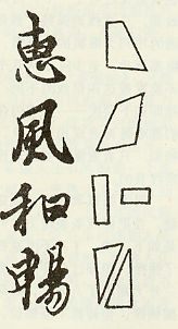 “惠”字的头部向左倾斜和“心”字向右下角下沉几乎造成一种结构之间的错位,各部分之间的中轴由垂直变成了倾斜。而“风”字则利用横画的右上耸起’,造成与“惠”字方向恰相反的一种欹侧效果。“和”字分左右两个部分,“禾”旁拉长成纵式,“口”则放扁成横式,造成在一个字中的纵,横交叉。至于“畅”字,则是一种斜向的头尾交叉,“申”与“易”两部分正好构成两三角形式的对位,但按照标准写法,它本来应该是两个长方形之间的简单组合的。于是,我们看到了这四个字的体型结构截然有别——贯穿于整个主轴线的对比效果。