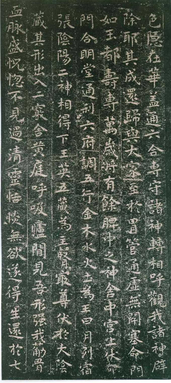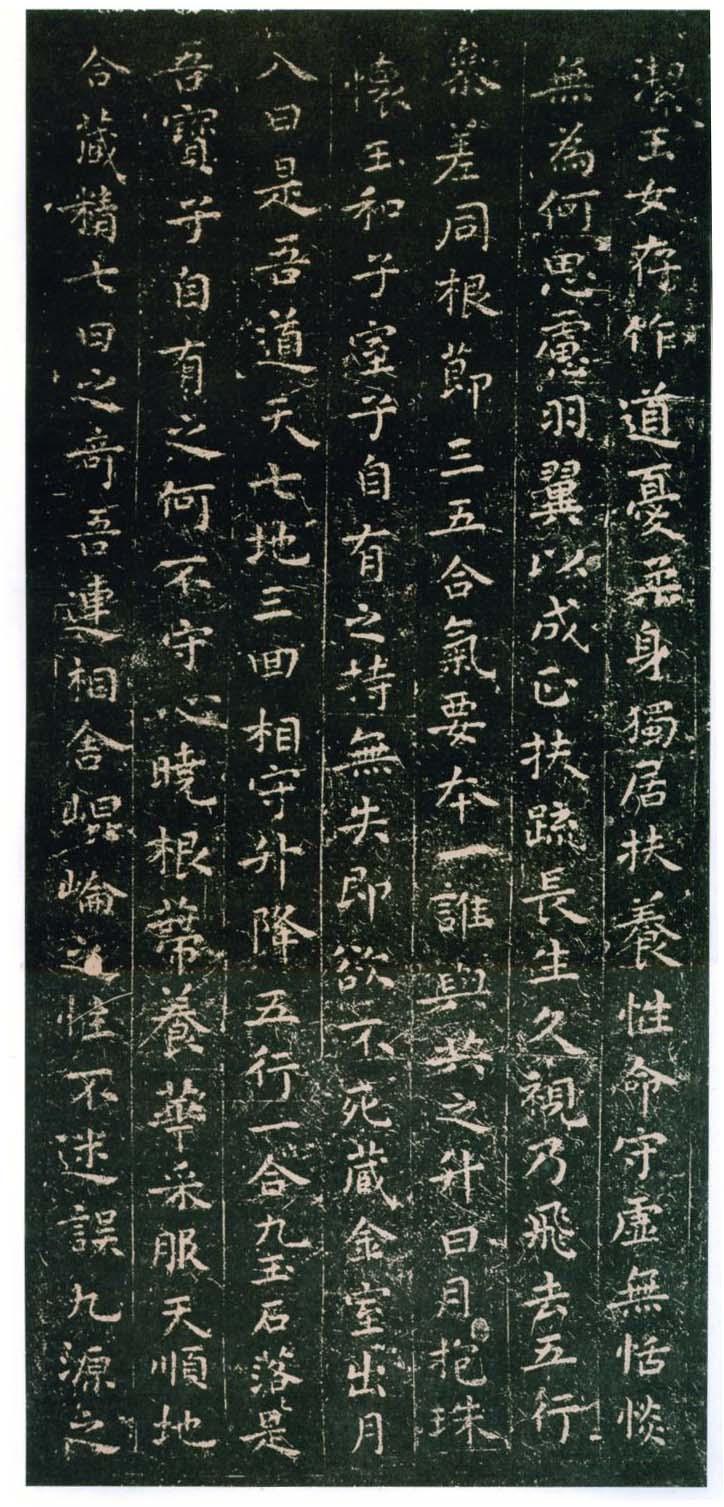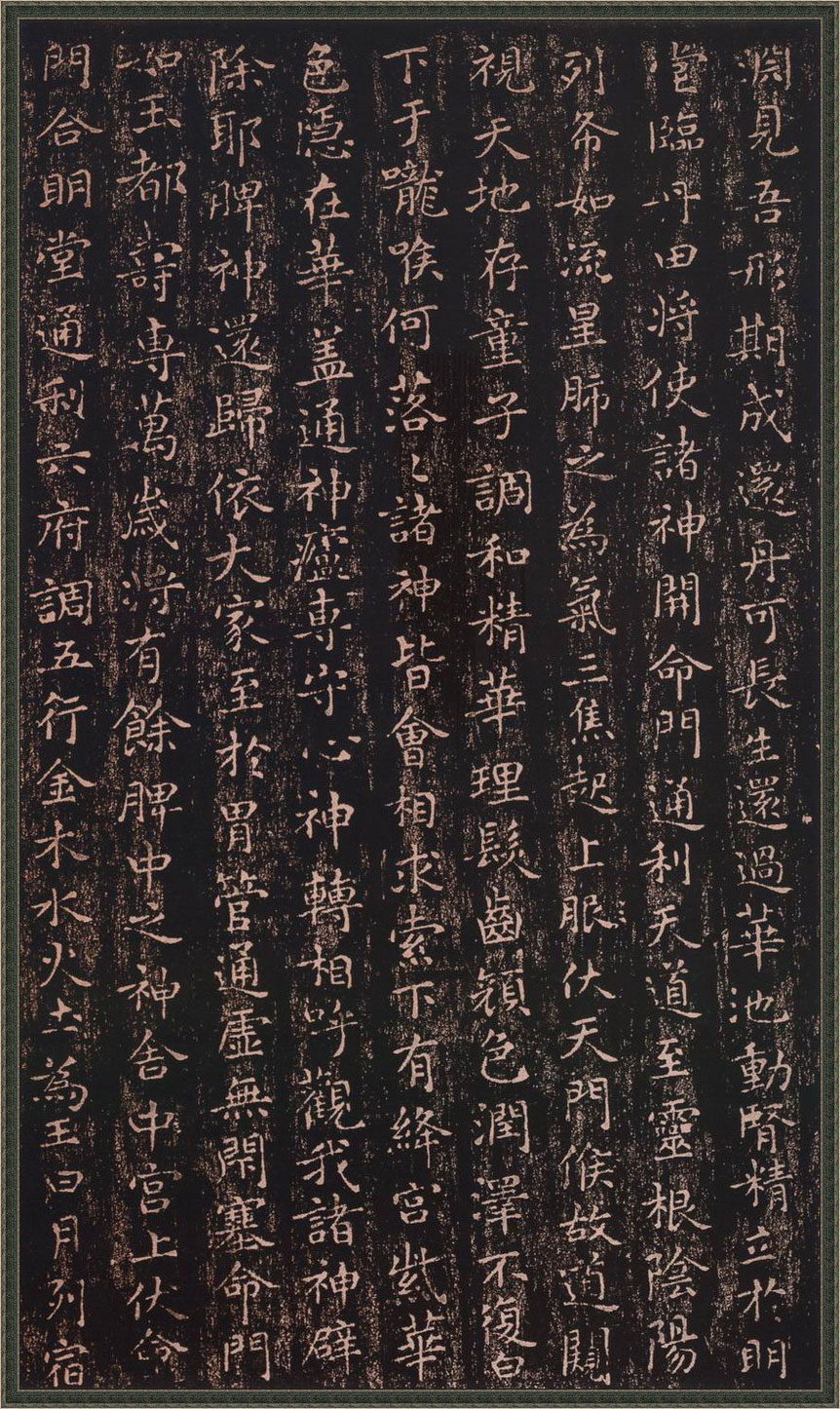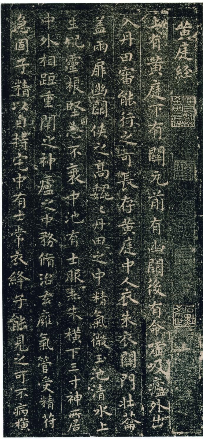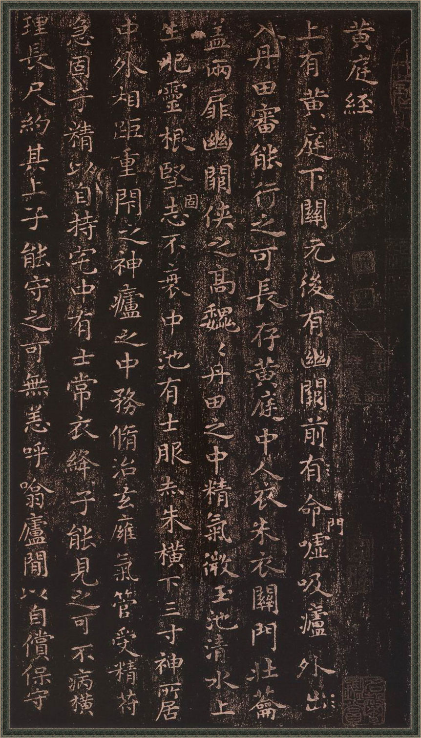 黄庭经释文:上有黄庭,下有关元,前有幽阙,后有命门,嘘吸庐外,出入丹田。审能行之可长存,黄庭中人衣朱衣,关门壮龠盖两扉,幽阙侠之高魏魏,丹田之中精气微,玉池清水上生肥,灵根坚固志不衰,中池有士服赤朱,横下三雨神所居,中外相踞重閈之,神庐之中务修治,玄膺气管受精苻,急固子精以自持,宅中有士常衣绛,子能见之可不病,横理长尺约其上,子能守之可无恙,呼吸庐间以自偿,保守貌坚身受庆,方寸之中谨盖藏,精神还归老复壮,侠以幽阙流下竟,养子玉树杖可扶,至道不烦不旁迕,灵台通天临中野,方寸之中至关下,玉房之中神门户,既是公子教我者,明堂四达法海员,真人子丹当我前,三阙之间精气深,子欲不死修昆仑,绛宫重楼十二级,宫室之中五采集,赤神之子中池立,下有长城玄谷邑,长生要眇房中急,弃捐摇俗专子精,寸田尺宅可治生,系子长流心安宁,观志流神三奇灵,闲暇无事修太平,常存玉房视明达,时念大仓不饥渴,役使六丁神女谒,閈子精路可长活,正室之中神所居,洗心自治无敢汙,历观五藏视节度,六府修治洁如素,虚无自然道之故,物有自然事不烦,垂拱无为心自安,虚无之居在廉间,寂寞旷然口不言,恬淡无为游德园,积精香洁玉女存,作道忧柔身独居,扶养性命守虚无,恬淡无为何思虑,羽翼以成正扶疏,长生久视乃飞去,五行参差同根节,三五合气要本一,谁与共之升日月,抱珠怀玉和子室,子自有之持无失,即欲不死藏金室,出月入日是吾道,天七地三回相守,升降五行一合九,玉石落落是吾宝,子自有之何不守,心晓根蒂养华采,服天顺地合藏精,七日之奇吾相舍,昆仑之性不迷误,九原之山何亭亭,中有真人可使令,蔽以紫宫丹城楼,侠以日月如明珠,万岁照照非有期,外本三阳物自来,内养三神可长生,魂欲上天魄入渊,还魂反魄道自然,旋玑悬珠环无端,玉石户金身貌坚,载地玄天迫乾坤,象以四时赤如丹,前仰后卑各异门,送以还丹与玄泉,象龟引气致灵根,中有真人巾金巾,负甲持苻开七门,此非枝叶实是根,昼夜思之可长存。仙人道士非可神,积精所致和专仁,人皆食谷与五味,独食大和阴阳气,故能不死天丰既,心为国主五藏王,受意动静气得行,道自守我精神光,昼日照照夜自守,渴自得饮饥自饱,经历六府藏卯酉,转阳之阴藏于九,常能行之不知老,肝之为气调且长,罗列五藏生三光,上合三焦道饮浆,我神魂魄在中央,随鼻上下知肥香,立于悬膺通神明,伏于老门候天道,近在于身还自守,精神上下开分理,通利天地长生草,七孔已通不知老,还坐阴阳天门候,阴阳下于通神明,过华盖下清且凉,入清冷渊见吾形,其成还丹可长生,下有华盖动见精,立于明堂临丹田,将使诸神开命门,通利天道至灵根,阴阳列布如流星,肺之为气三焦起,上伏天门候故道,窥离天地存童子,调利精华调发齿,颜色润泽不复白,下于咙喉何落落,诸神皆会相求索,下有绛宫紫华色,隐在华盖通六合,专守诸神转相呼,观我诸神辟除耶,其成还归与大家,至于胃管通虚无,閈塞命门如玉都,寿专万岁将有余,脾中之神舍中宫,上伏命门合明堂,通利六府调五行,金木水火土为王,日月列宿张阴阳,二神相得下王英,五藏为主肾最尊,伏于大阴藏其形,出入二窍舍黄庭,呼吸庐间见吾形,强我筋骨血脉盛,恍惚不见过清灵,恬淡无欲遂得生,还于七门饮大渊,道我玄膺过清灵,问我仙道与奇方,头载白素距丹田,沐浴华池生灵根,被发行之可长存,二府相得开命门,五味皆至善气还,常能行之可长生。永和十二年五月二十四日五山阴县写。