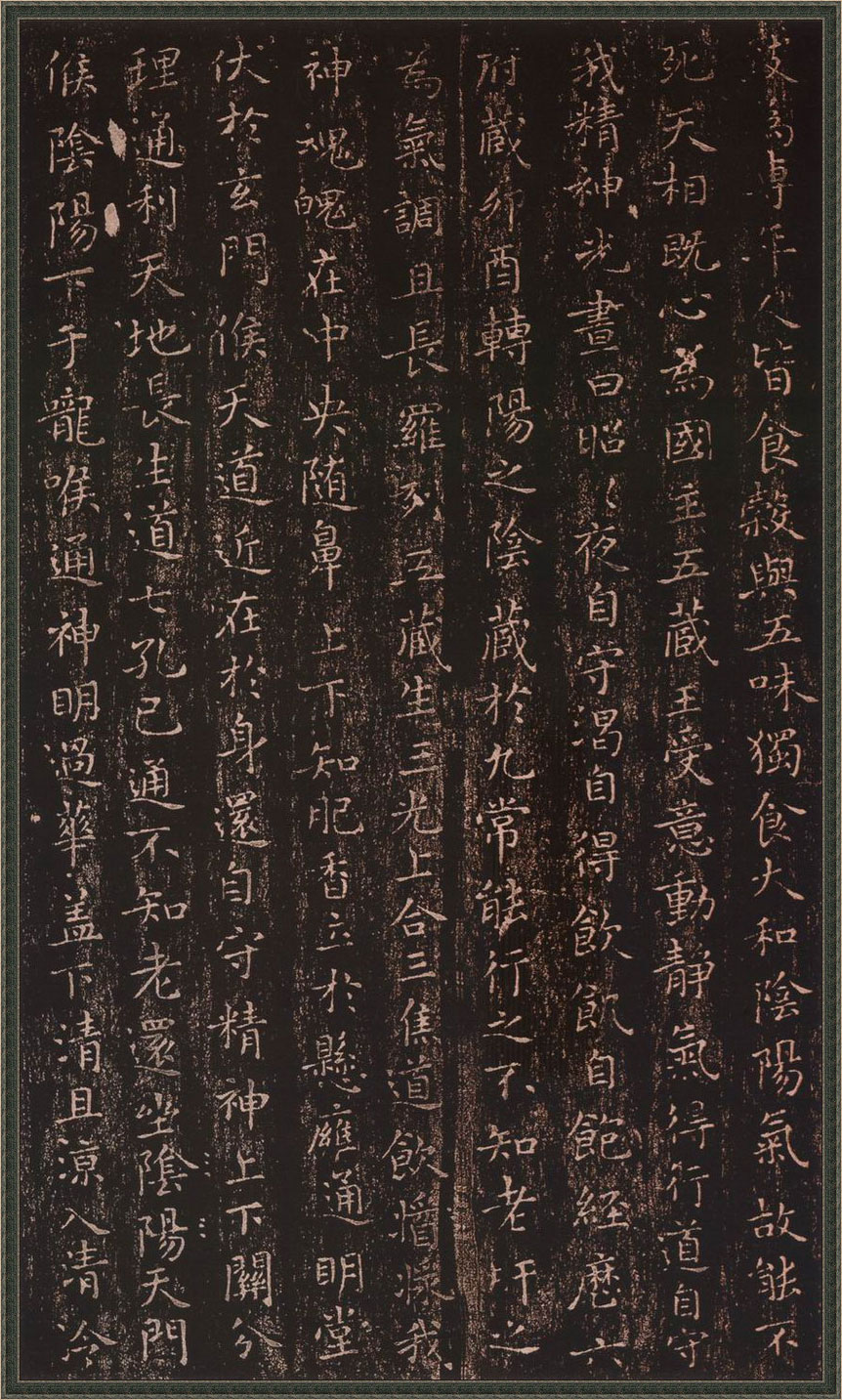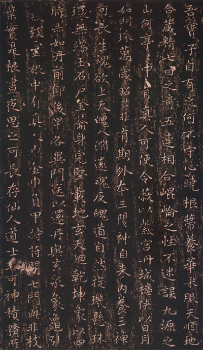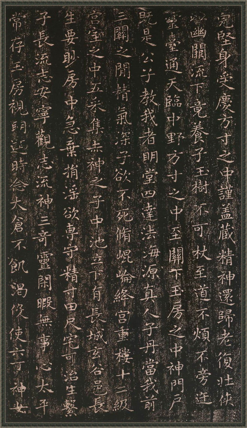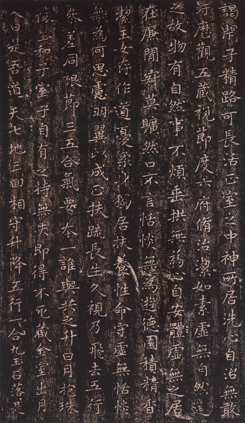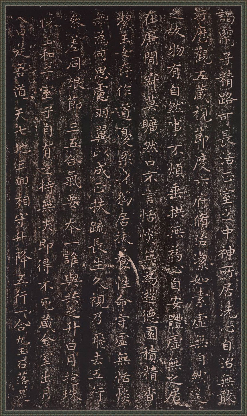 黄庭经释文:上有黄庭,下有关元,前有幽阙,后有命门,嘘吸庐外,出入丹田。审能行之可长存,黄庭中人衣朱衣,关门壮龠盖两扉,幽阙侠之高魏魏,丹田之中精气微,玉池清水上生肥,灵根坚固志不衰,中池有士服赤朱,横下三雨神所居,中外相踞重閈之,神庐之中务修治,玄膺气管受精苻,急固子精以自持,宅中有士常衣绛,子能见之可不病,横理长尺约其上,子能守之可无恙,呼吸庐间以自偿,保守貌坚身受庆,方寸之中谨盖藏,精神还归老复壮,侠以幽阙流下竟,养子玉树杖可扶,至道不烦不旁迕,灵台通天临中野,方寸之中至关下,玉房之中神门户,既是公子教我者,明堂四达法海员,真人子丹当我前,三阙之间精气深,子欲不死修昆仑,绛宫重楼十二级,宫室之中五采集,赤神之子中池立,下有长城玄谷邑,长生要眇房中急,弃捐摇俗专子精,寸田尺宅可治生,系子长流心安宁,观志流神三奇灵,闲暇无事修太平,常存玉房视明达,时念大仓不饥渴,役使六丁神女谒,閈子精路可长活,正室之中神所居,洗心自治无敢汙,历观五藏视节度,六府修治洁如素,虚无自然道之故,物有自然事不烦,垂拱无为心自安,虚无之居在廉间,寂寞旷然口不言,恬淡无为游德园,积精香洁玉女存,作道忧柔身独居,扶养性命守虚无,恬淡无为何思虑,羽翼以成正扶疏,长生久视乃飞去,五行参差同根节,三五合气要本一,谁与共之升日月,抱珠怀玉和子室,子自有之持无失,即欲不死藏金室,出月入日是吾道,天七地三回相守,升降五行一合九,玉石落落是吾宝,子自有之何不守,心晓根蒂养华采,服天顺地合藏精,七日之奇吾相舍,昆仑之性不迷误,九原之山何亭亭,中有真人可使令,蔽以紫宫丹城楼,侠以日月如明珠,万岁照照非有期,外本三阳物自来,内养三神可长生,魂欲上天魄入渊,还魂反魄道自然,旋玑悬珠环无端,玉石户金身貌坚,载地玄天迫乾坤,象以四时赤如丹,前仰后卑各异门,送以还丹与玄泉,象龟引气致灵根,中有真人巾金巾,负甲持苻开七门,此非枝叶实是根,昼夜思之可长存。仙人道士非可神,积精所致和专仁,人皆食谷与五味,独食大和阴阳气,故能不死天丰既,心为国主五藏王,受意动静气得行,道自守我精神光,昼日照照夜自守,渴自得饮饥自饱,经历六府藏卯酉,转阳之阴藏于九,常能行之不知老,肝之为气调且长,罗列五藏生三光,上合三焦道饮浆,我神魂魄在中央,随鼻上下知肥香,立于悬膺通神明,伏于老门候天道,近在于身还自守,精神上下开分理,通利天地长生草,七孔已通不知老,还坐阴阳天门候,阴阳下于通神明,过华盖下清且凉,入清冷渊见吾形,其成还丹可长生,下有华盖动见精,立于明堂临丹田,将使诸神开命门,通利天道至灵根,阴阳列布如流星,肺之为气三焦起,上伏天门候故道,窥离天地存童子,调利精华调发齿,颜色润泽不复白,下于咙喉何落落,诸神皆会相求索,下有绛宫紫华色,隐在华盖通六合,专守诸神转相呼,观我诸神辟除耶,其成还归与大家,至于胃管通虚无,閈塞命门如玉都,寿专万岁将有余,脾中之神舍中宫,上伏命门合明堂,通利六府调五行,金木水火土为王,日月列宿张阴阳,二神相得下王英,五藏为主肾最尊,伏于大阴藏其形,出入二窍舍黄庭,呼吸庐间见吾形,强我筋骨血脉盛,恍惚不见过清灵,恬淡无欲遂得生,还于七门饮大渊,道我玄膺过清灵,问我仙道与奇方,头载白素距丹田,沐浴华池生灵根,被发行之可长存,二府相得开命门,五味皆至善气还,常能行之可长生。永和十二年五月二十四日五山阴县写。