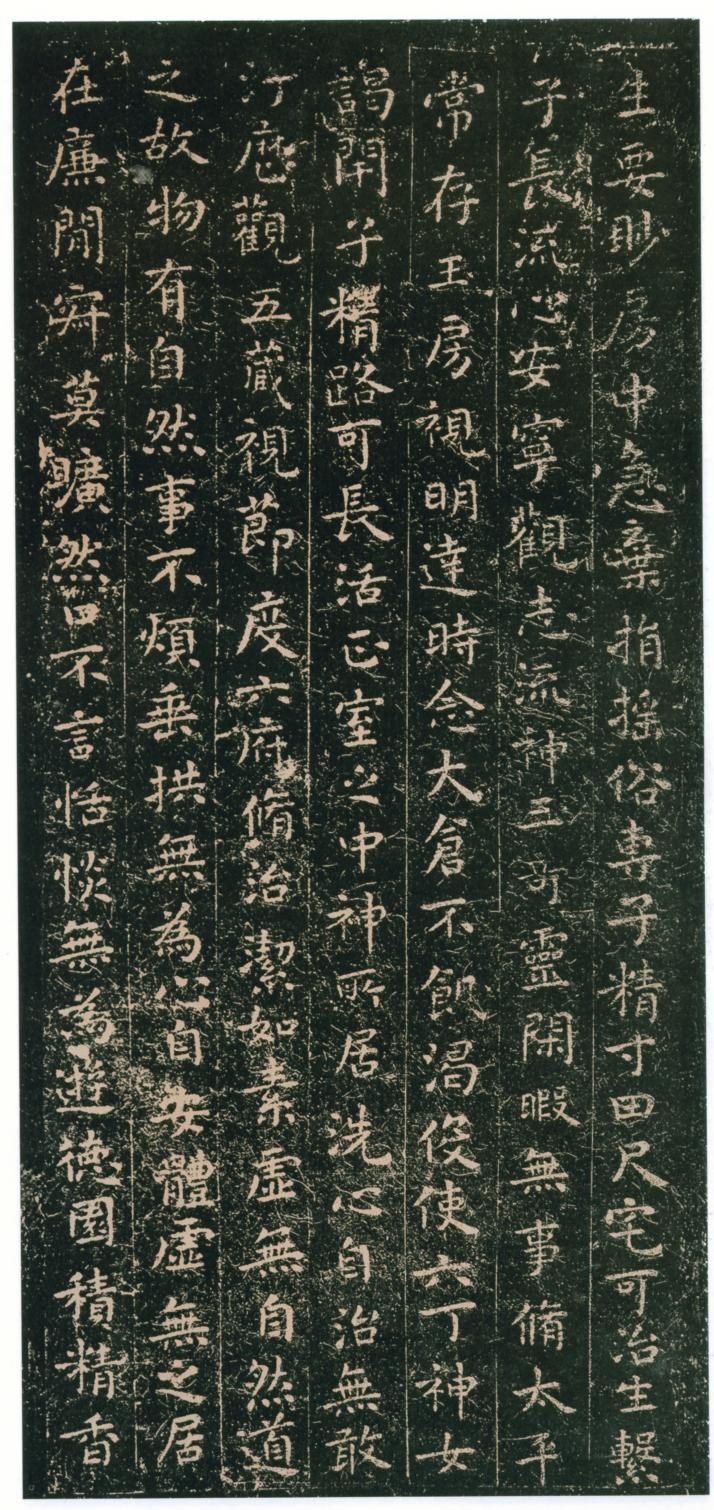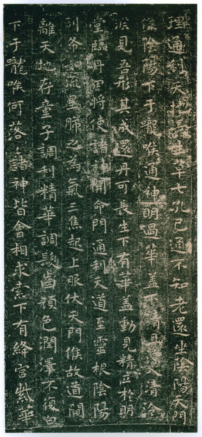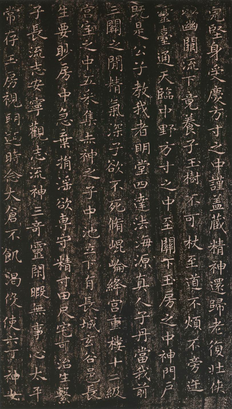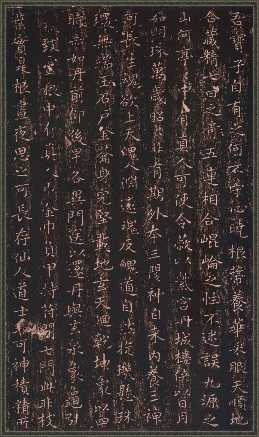 黄庭经释文:上有黄庭,下有关元,前有幽阙,后有命门,嘘吸庐外,出入丹田。审能行之可长存,黄庭中人衣朱衣,关门壮龠盖两扉,幽阙侠之高魏魏,丹田之中精气微,玉池清水上生肥,灵根坚固志不衰,中池有士服赤朱,横下三雨神所居,中外相踞重閈之,神庐之中务修治,玄膺气管受精苻,急固子精以自持,宅中有士常衣绛,子能见之可不病,横理长尺约其上,子能守之可无恙,呼吸庐间以自偿,保守貌坚身受庆,方寸之中谨盖藏,精神还归老复壮,侠以幽阙流下竟,养子玉树杖可扶,至道不烦不旁迕,灵台通天临中野,方寸之中至关下,玉房之中神门户,既是公子教我者,明堂四达法海员,真人子丹当我前,三阙之间精气深,子欲不死修昆仑,绛宫重楼十二级,宫室之中五采集,赤神之子中池立,下有长城玄谷邑,长生要眇房中急,弃捐摇俗专子精,寸田尺宅可治生,系子长流心安宁,观志流神三奇灵,闲暇无事修太平,常存玉房视明达,时念大仓不饥渴,役使六丁神女谒,閈子精路可长活,正室之中神所居,洗心自治无敢汙,历观五藏视节度,六府修治洁如素,虚无自然道之故,物有自然事不烦,垂拱无为心自安,虚无之居在廉间,寂寞旷然口不言,恬淡无为游德园,积精香洁玉女存,作道忧柔身独居,扶养性命守虚无,恬淡无为何思虑,羽翼以成正扶疏,长生久视乃飞去,五行参差同根节,三五合气要本一,谁与共之升日月,抱珠怀玉和子室,子自有之持无失,即欲不死藏金室,出月入日是吾道,天七地三回相守,升降五行一合九,玉石落落是吾宝,子自有之何不守,心晓根蒂养华采,服天顺地合藏精,七日之奇吾相舍,昆仑之性不迷误,九原之山何亭亭,中有真人可使令,蔽以紫宫丹城楼,侠以日月如明珠,万岁照照非有期,外本三阳物自来,内养三神可长生,魂欲上天魄入渊,还魂反魄道自然,旋玑悬珠环无端,玉石户金身貌坚,载地玄天迫乾坤,象以四时赤如丹,前仰后卑各异门,送以还丹与玄泉,象龟引气致灵根,中有真人巾金巾,负甲持苻开七门,此非枝叶实是根,昼夜思之可长存。仙人道士非可神,积精所致和专仁,人皆食谷与五味,独食大和阴阳气,故能不死天丰既,心为国主五藏王,受意动静气得行,道自守我精神光,昼日照照夜自守,渴自得饮饥自饱,经历六府藏卯酉,转阳之阴藏于九,常能行之不知老,肝之为气调且长,罗列五藏生三光,上合三焦道饮浆,我神魂魄在中央,随鼻上下知肥香,立于悬膺通神明,伏于老门候天道,近在于身还自守,精神上下开分理,通利天地长生草,七孔已通不知老,还坐阴阳天门候,阴阳下于通神明,过华盖下清且凉,入清冷渊见吾形,其成还丹可长生,下有华盖动见精,立于明堂临丹田,将使诸神开命门,通利天道至灵根,阴阳列布如流星,肺之为气三焦起,上伏天门候故道,窥离天地存童子,调利精华调发齿,颜色润泽不复白,下于咙喉何落落,诸神皆会相求索,下有绛宫紫华色,隐在华盖通六合,专守诸神转相呼,观我诸神辟除耶,其成还归与大家,至于胃管通虚无,閈塞命门如玉都,寿专万岁将有余,脾中之神舍中宫,上伏命门合明堂,通利六府调五行,金木水火土为王,日月列宿张阴阳,二神相得下王英,五藏为主肾最尊,伏于大阴藏其形,出入二窍舍黄庭,呼吸庐间见吾形,强我筋骨血脉盛,恍惚不见过清灵,恬淡无欲遂得生,还于七门饮大渊,道我玄膺过清灵,问我仙道与奇方,头载白素距丹田,沐浴华池生灵根,被发行之可长存,二府相得开命门,五味皆至善气还,常能行之可长生。永和十二年五月二十四日五山阴县写。
