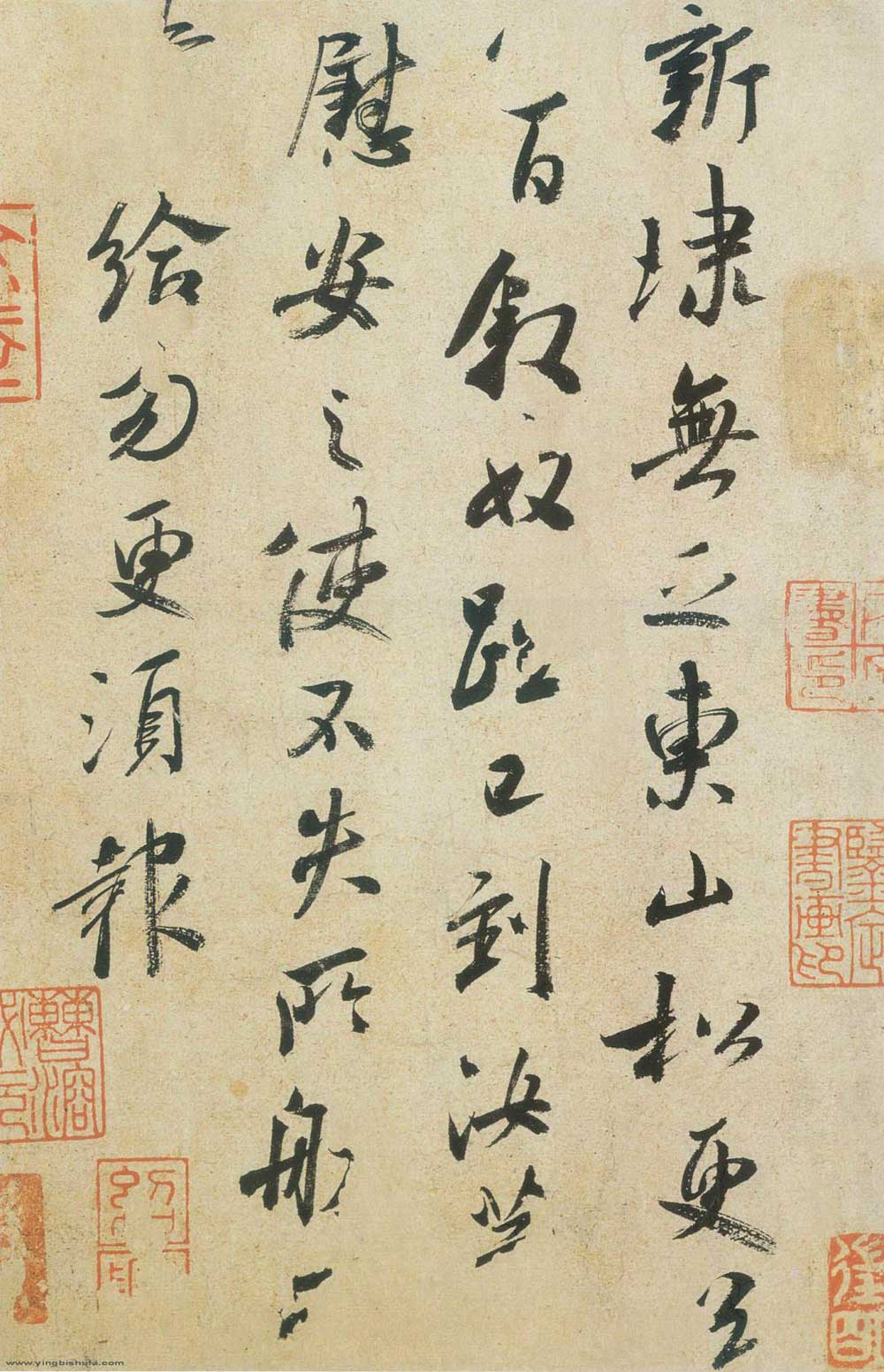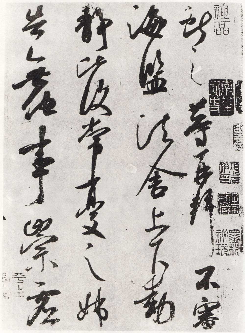 《鹅群帖》与《鸭头丸帖》二帖,草、行相参,随兴变化,不主故常,笔画连绵相属,气势奔放洒脱,毫无顾忌,正体现出献之豪放不羁的性情与功力相生相发的高度结合。《鹅群帖》此帖传为宋临本,点画如挺竖、蟹爪钩,字势峻傲,重心摇撼向下的行气特征,颇合米芾家法。线条轻重,字之大小皆悬殊多变,纵敛交互的姿态使形式章法充满纵向穿透力及横向的开拓张力。章法大开大合,数字一笔的挥运令人赞叹。