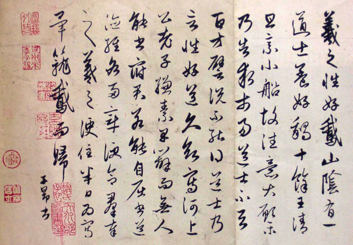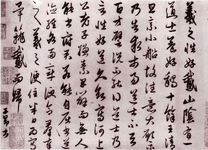 羲之性好鹅,山隂有一道士养好鹅十余,王清旦乗小船故往,意大愿乐。乃告求市易,道士不与,百方譬说不能得。道士乃言性好道,久欲写河上公《老子》缣素,早办而无人能书,府君若能自屈,书《道徳经》各两章,便合群以奉之。羲之便住半日,为写毕,笼鹅而归。