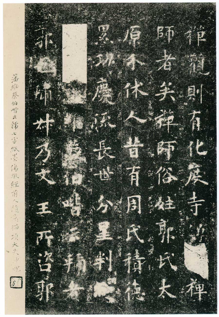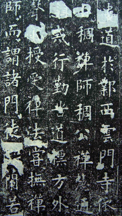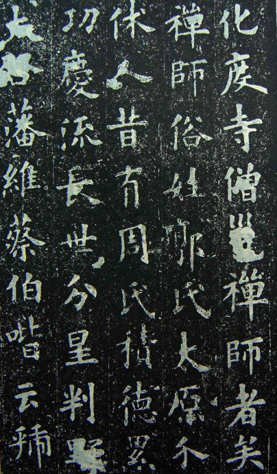 盖闻人灵之贵,天象攸凭,禀仁义之和,感山川之秀,穷理尽性,通幽洞微。研其虑者百端,宗其道者三教,殊源异轸,类聚群分。或博而无功,劳而寡要,文胜则史,礼烦斯黩。或控鹤乘鸾,有系风之谕;餐霞御气,致捕影之讥。至於察报应之方,穷死生之变,大慈(阙)运宏济群品,极众妙而为言,冠元宗以立德,其唯真如之设教焉。若夫性与天道,契协神交,贻照灵心,澄神禅观,则有化度寺僧邕禅师者矣。禅师俗姓郭氏,太原介休人。昔有周氏,积德累功,庆流长世,分星判野,大启藩维。蔡伯喈云:「虢者郭也。虢叔乃文王所咨,郭泰则人伦攸属。」圣贤遗烈,奕叶其昌。祖宪,荆州刺史,早擅风猷。父韶,博陵太守,深明典礼。禅师含灵福地,擢秀华宗,爰自弱龄,神识沈静,率由至道,冥符上德。因戏成塔,发自髫年;仁心救蚁。始於岁。世传儒业,门多贵仕。时方小学,齿骨上庠,始自趋庭,便观入室,精勤不倦,聪敏绝伦,博览群书,尤明老易。然雅有志尚,高迈俗情,时游僧寺,伏膺释典,风鉴疏朗,豁然开悟。闻法海之微妙,毛同喜;瞻满月之图像,身心俱净。於是锱铢轩冤,糟粕邱坟,年十有三,违亲入道,於邺西云门寺,依止稠禅师。稠公禅慧通(阙)戒行勤苦,道标方外,声溢区中。(阙)睹暗投,欣然惊异,即授受禅法,数日便诣幽深。稠公尝抚禅师而谓诸门徒曰:「五亭(阙)念尽在此矣。」头ヌ兰若,毕志忘疲,仍来往林虑山中,栖托游处。後属周武平齐,像往林虑,入白鹿深山,避时削迹,藏声戢曜,枕石漱流。(阙)岩之下葺茆成室,萝裳薜带,(阙)唯粪(阙)之衣;饵术餐松,尝无麻麦之饭。三迳斯绝,百(阙)为群,猛鸷毒螫之徒;潜形匿影,白鹿青鸾之辈。效祉呈祥,每梵音瞻礼,焚香读(阙二字)奇禽异兽,攒集庭宇,俱绝(阙)倚毕来俯伏,貌如恭敬,心疑听受。及开皇之初,宏(阙)释教,於时有魏州信行禅师,(阙)明佛性,大转法轮,实命世之异人,为元门之益(阙)以道隐之辰,习当根之业,智禅师Т世幽居,遣人告曰:「修道立行,宜以济度为先,(阙)善其身,非所闻也。宜尽宏益之方,昭示流俗。」禅师乃出山,与信行禅(阙)修苦行。开皇九年,信行禅师被敕徵召,乃相随入京。京师道俗,莫不遵奉信行禅(阙三字)之(阙二字)持徒众,以贞观五年十一月十六日,终於化度寺,春秋八十有九。圣上崇敬(阙二字)赠帛追福,即以其月廿二日,奉送灵塔於终南山下鸱鸣圯,禅师之遗令也。徒众收其舍利,起塔於信行禅师灵塔之左。禅师风范凝正,行业精勤。十二部经,尝甘露而俱尽;五百具戒,凌严霜而未。虽托迹禅林,避心定水,涉无为之境,绝有待之累,(阙)寓形岩穴,高步京华,常卑辞屈已,体道藏器。未若道安之游樊沔,对凿齿而自伐弥天;慧远之在庐山,折桓元之致敬人主。及迁神净土,委质ヌ林,四部奔驰,十方号慕,岂止寝歌辍相,舍佩捐珠而已?式昭景行,乃述铭云: