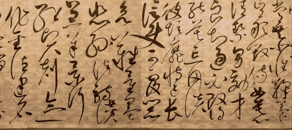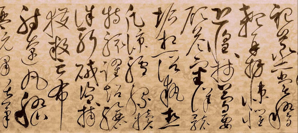 此作总体气象可谓神满气足,全篇浩浩荡荡有如奔腾之水顺势而行,视觉上贯彻始终是其吸引欣赏者目光的重要因素,正如陶宗仪在《书史会要》中的阐释那般:“意度天成,非可以形迹求也。”此作为长卷,在上面书写草书,一定程度上约束了书家性情的发挥。为何如此说?缘于书法的表现维度是自上而下的,特别是草书,一些率性之笔,往往是在纵向空间中产生的,而横向展开的空间毕竟很有限。
