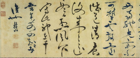 祝允明楷书得益于李应祯的指点,得欧字之骨,颜楷之雄,褚字之秀、虞字之腴,尤善小楷,直追魏晋人遗意,从而在年轻时就打下了扎实的基本功。楷法既立,流溢为行草则自然可观,再加上他疏放不羁的个性,更使他对草书情有独钟,他的草书主要得徐有贞的指点,由旭素上溯二王,中年以后涉猎渐广,自魏晋钟王直至元之赵孟頫,莫不临写工绝,故其书至晚年时变化出入不可端倪,风骨烂漫,一派天真纵逸,从他流传下来的草书作品来看,面目各异,有形不贯而气贯的独草,有如行云流水的今草,亦有气势奔放的狂草,不论何种形式的草书,都写得开张舒放,跌宕奇逸,笔力遒劲,点画狼藉,看似乱其实不乱,看似散其实气脉贯注,并不因率意而潦草,笔笔都能断而后起,能于使转中见点画,故通幅视之,显得神釆奕奕,气势豪放。王世贞《艺苑卮言》评祝允明书谓:『晚节变化出入,不可端倪,风骨烂漫,天真纵逸。』此帖足可当之。