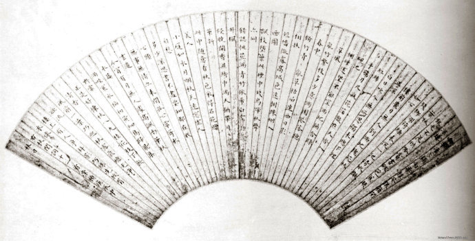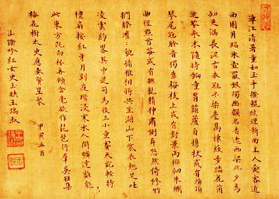 《秋闺词自作七言诗十一首》,金笺纸扇面小楷,纵18.5厘米,横51.4厘米。吉林省博物馆藏。此帧董小宛楷书秋闺诗词是一件不可多得的书法艺术作品,对考证董氏与冒襄的感情经历也具有重要参考价值。细品诗境,感怀伤秋,可感受到在封建礼教重重束缚下一个弱冠女子追求自由的心声。其小楷工整清秀,毫端尽得远古书家精髓。