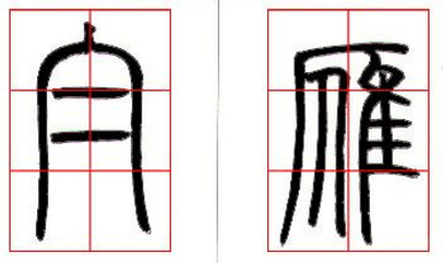 3、参差关系:篆书下垂的线条有两条或两条以上的时候,应当讲究垂脚的参差变化。如(图十一)“白”字,虽只两条垂脚,但也有高低的不同。再如(图十一)“雁”字四条垂脚的参差变化。
