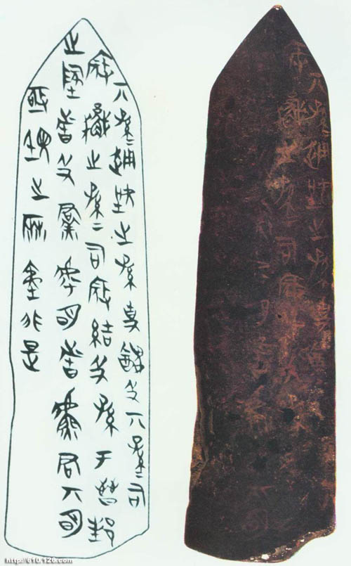 1965年山西侯马晋国遗址出土了大量盟誓辞文玉石片,称为“侯马盟书”,又称“载书”,共有5000余件,每件玉片大小不一,磨琢精致,用毛笔书写,字迹与春秋晚期的铜器铭文相似,大部分是朱红色,也有小部分是黑色的,比较清晰。因为玉片大小不一,字数也有多有少,多的达200左右,少的只有十余字。侯马盟书是春秋晚期晋国赵鞅与卿大夫订立的文字条约,要求参加盟誓的人都效忠盟主,一致诛讨已被驱逐在外的敌对势力,不再扩充奴隶、土地、财产,不与敌人来往。