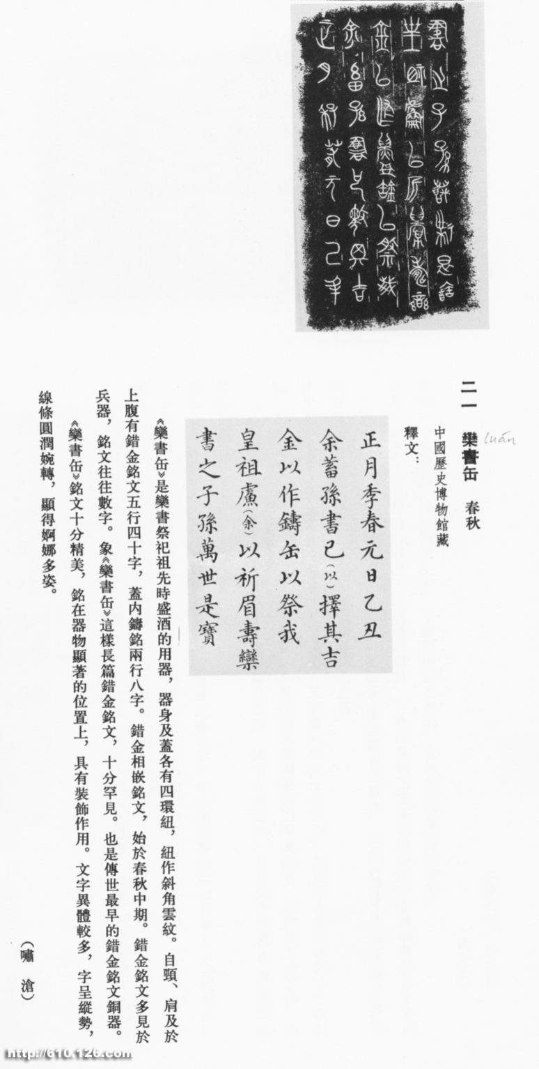 错金相嵌铭文,始於春秋中期。错金铭文多见於兵器,铭文往往数字。象《栾书缶》这样长篇错金铭文,十分罕见。也是传世最早的错金铭文铜器。《栾书缶》铭文十分精美,铭在器物显著的位置上,具有装饰作用,文字异体较多,字呈纵势,线条圆婉转,显得婀娜多姿。此缶无论从器形还是字体看,都属楚国作风,故可能是后来入于楚国的栾书子孙的遗物。