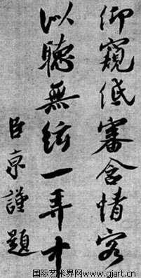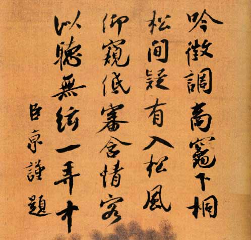 蔡京《听琴图题诗》,北京故宫博物院藏。《听琴图》是宋徽宗赵佶人物画的代表作。左上有瘦金书“听琴图”三字,左下另书“天下一人”押。蔡京深得徽宗宠信,所以在他的绘画作品上多有蔡京的题记,题诗。画面上方,蔡京题七言绝句一首,形容画中情景,颂扬琴声的清越宛妙,书法欹侧姿媚,工力深厚,字势豪健,痛快沉着。