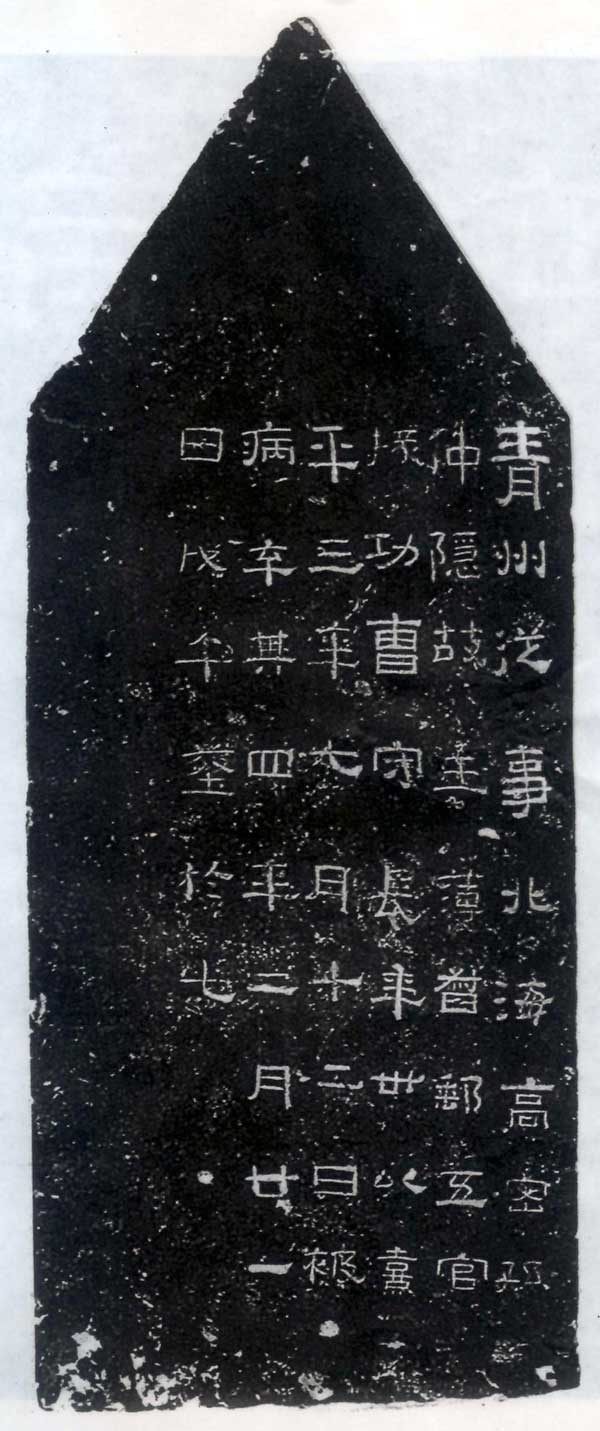 高密孙氏,系殷纣王的叔父比干之后。为当 时高密一带大族,而且显赫于世。《汉安平相孙根 碑》称孙根为“司空公之伯子,乐安太守之兄子,汉 阳太守、侍御史之兄,乘氏令之考·”(据《隶样》卷 第十—所谓司空公者,即孙朗是也。《后汉书·桓 帝纪》载:“水寿三年,太常北海孙朗为司空。”《汉 三公名》又云:“朗,北海高密人。”又据《隶释》卷 第二十七记:“《汉安平相孙君碑》,在高密县西南 五十里。”与《孙仲隐墓志》距高密县城方向、里程 均相一致(按高密县于武德六年(六二三)置,即今 高密县城),是否同属一汉墓群,值得考虑。