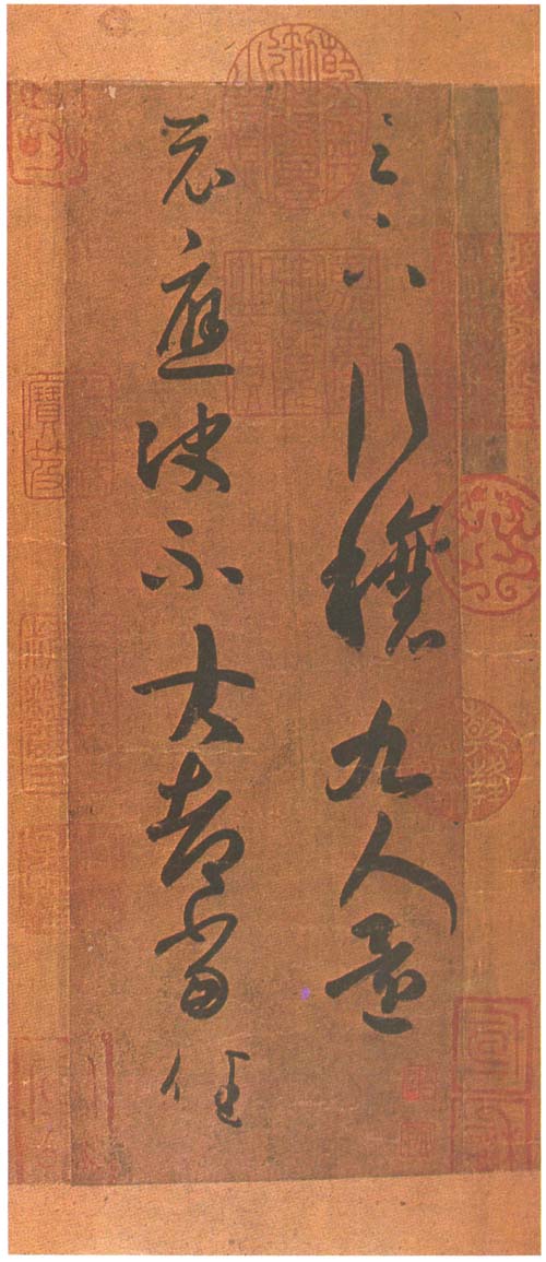 王羲之《行穰帖》,原迹已失传。此为初唐时期的双钩填墨摹本,硬黄纸本,传为米芾再临本,24.4×8.9cm。二行,十五字,由北宋徽宗金泥题签和宣和之印,曾为董其昌友人吴廷所藏,明董其昌有多处题跋,后入清宫,乾隆有题跋题诗及鉴赏印。董其昌跋:“东坡所谓‘君家两行十三字,气压邺侯三万签’者,此帖是耶?”乾隆帝则赞它“于浑穆中精光内韫”。