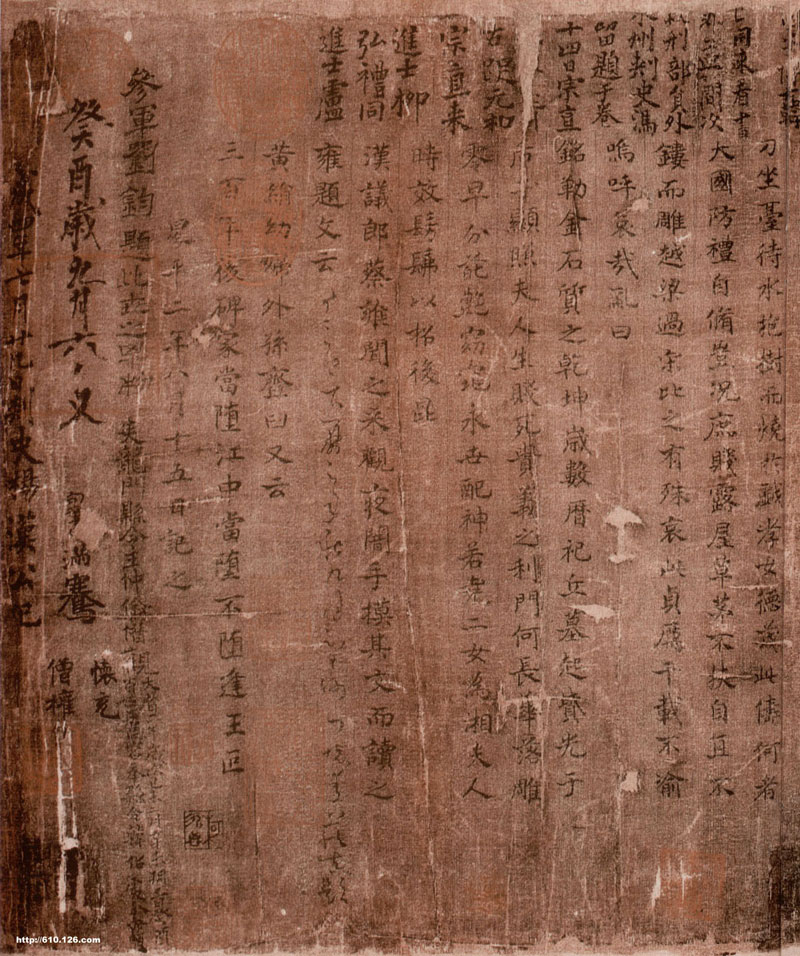此卷内容为东汉上虞县长度尚为孝女曹娥所写的诔辞,文章作于东晋穆帝N平二年(358)。书心字体扁方,有大量晋唐人观款,卷后有宋高宗赵构、元虞集、赵孟頫、乔篑成等人题跋。曾经南朝萧梁内府,南宋内府、贾似道,元内府、郭天锡、柯九思,明韩世能、王锡爵,清王时敏、清内府等庋藏。