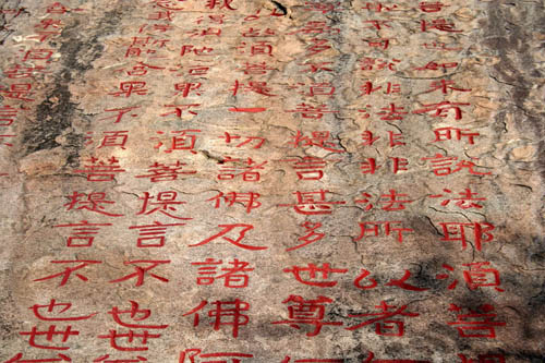 《泰山经石峪》,又名《泰山佛说金刚经》,摩崖石刻,北齐天保间刻,刻于山东泰山斗母宫东此一公里山谷之溪床上。字径50厘米,字体介于隶楷之间,据民国初拓本计,存九百六十余字。是现存摩崖石刻中规模空前的巨制。通篇文字气势磅礴,其优游自如从容不迫之仪态,若具仙姿;其用笔圆润可人,包融篆隶而妙化为楷,结构舒博壮健,颇含浑穆宽阔之趣。清杨守敬曰:“北齐《泰山经石峪》以径尺之大书,如作小楷,纡徐容与,绝无剑拔弩张之迹,擘窠大书,此为极则。”用笔安详从容,风神澹泊雍荣大度,结体奇特斜倚相生,充满个性。被尊“大字鼻祖”和“榜书之宗”。《泰山经石峪金刚经》,无撰书人姓名,因笔法与山东邹县尖山摩崖《晋昌王唐邕题名》相近,后人或以为唐邕所书。又与《徂徕山大般若经》相似。《徂徕山大般若经》上有“齐武平元年王子椿造”字样,因此后人又有推测为王子椿所书。清阮元《山左金石志》则作北齐天保间(公元550--559)人所作。《泰山经石峪金刚经》多有一些不常见的俗字,其中“万” 、“无”二字,竟与现行通用的简化字相同。这封於研究我国书体的历史演变和书法艺术成就,具有相当重要的价格。