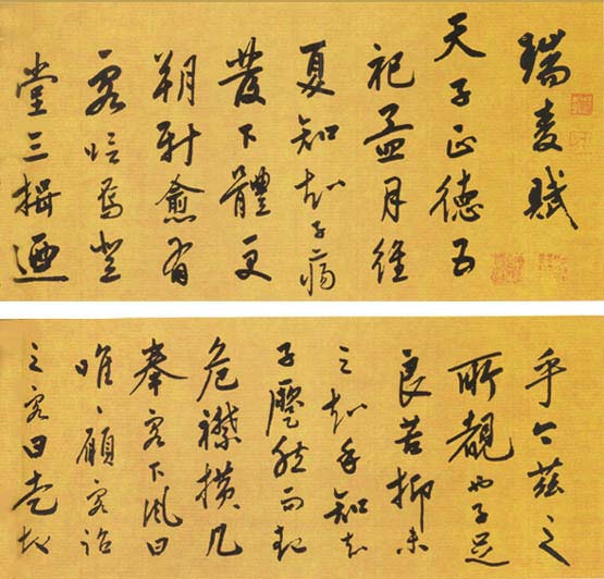 《瑞麦赋》有上下卷,长3米左右,350余行,上卷从“瑞麦赋”三字标题开始,至“受冻而仆者又如干矣”止,共145行,下卷自“天子轸念南服”至末行题款,共213行。现北京故宫博物院藏。明代著名政治家夏言曾经说“文裕书法妙逼钟、王、比之赵雪松而遒劲过之。”莫如忠云:“俨山先山书法雅宗赵松雪,晚熔李北海,两晋风格,宛然县存、足传不朽。”其书在吴门书法盛行之际,在松江地区别树一帜。但明代人对书法艺术的评价总不能合乎实际。像陆深的《瑞麦赋》这样的作品不论是当时还是后来,都不能算是第一流。其笔力固有过人之处,然结体气韵皆俗而不足法。