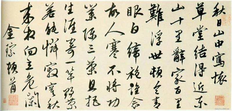 金琮(1449-1501)明代人,字元玉,自号赤松山农,金陵(今南京)人。少聪颖,好吟咏,善书画,年十二、三即能大书。初法赵孟頫,晚学张雨。画梅学扬无咎,他也是作赵孟頫书画伪的能手。他临赵氏作品,往往将题款一并临下,然后,在篇末老老实实落上自己的名款。由于金琮的书法很似赵书,故很多金琮的字,即使不是有意作伪,也被后人挖去原款,添上“赵孟頫”三字,以欺世人。